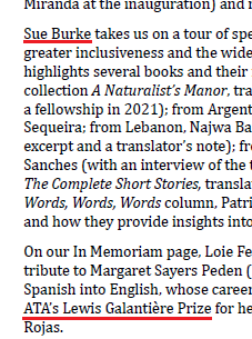 It says I won the American Translators Association Lewis Galantière Prize in 2010. I did not. I checked the footnote, and what I think happened is that my name and the prize were both mentioned on the same page of an ATA magazine (see photo). Proximity amounts to correlation for an AI.